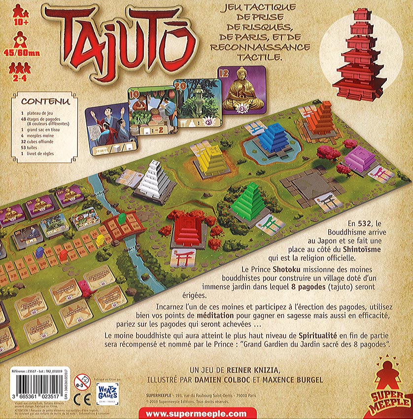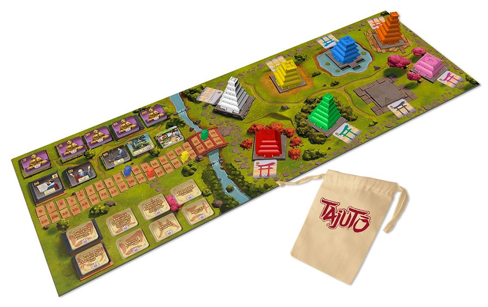 Dans Tajuto, les joueurs devront bâtir des Tajuto, temples japonais, grâce à l’activation de tuiles d’actions. Ils pourront également y faire des offrandes ou encore améliorer leurs capacités en consacrant des points de méditation qu’ils auront, justement, obtenu grâce à leurs constructions et offrandes. À l’issue de la partie, le moine ayant acquis le plus de points de spiritualité sera déclaré vainqueur !