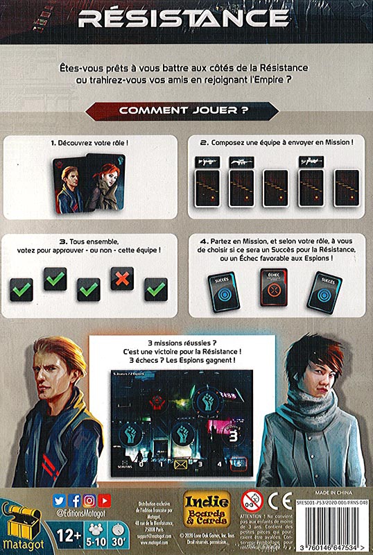 L’Empire doit tomber. Nous sommes la Résistance ! Et la Résistance doit vaincre. Mais des espions ont infiltré nos rangs, prêts à tout pour saboter nos missions contre l’Empire. Il faut les démasquer. Pour cela, il faut choisir les bons agents à envoyer en mission afin de cumuler les succès !