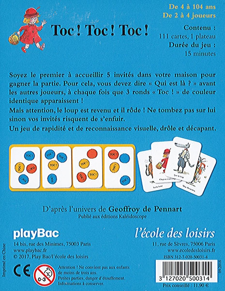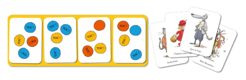 Lorsque 3 ronds « Toc ! » de la même couleur apparaissent, le premier joueur qui dit « Qui est là ? » collecte une carte « Invité ». Dès que vos 5 invités sont à l’abri, c’est gagné !