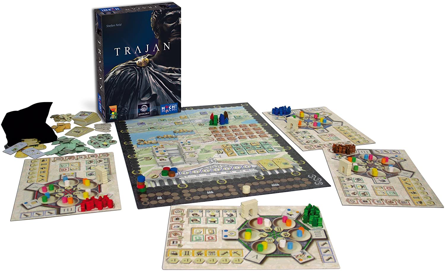 En l’an 110, sous le règne l’Empereur Trajan, Rome est à l’apogée de sa gloire et les patriciens se focalisent sur le pouvoir et la richesse. Les joueurs glanent leurs points en fonction d’opportunités offertes dans 6 domaines. Il faut savoir y manoeuvrer, mais le Port et son commerce peuvent rapporter beaucoup. S’investir habilement au Sénat apportera des avantages en fin de partie, tandis que le Forum offre des privilèges qui évitent de perdre des points. L’engagement Militaire nécessite des soldats: ressources et lauriers y récompenseront les conquérants de nouveaux territoires. Construire demande également de la main d’oeuvre, mais peut rapporter gros en termes d’opportunités. Enfin, l’optimisation de chaque Arc de Triomphe permet de récupérer des atouts supplémentaires lors de la sélection de vos actions. La clé de votre succès est dans la gestion intelligente des ressources, dont la circulation s’effectue de façon originale, à la manière d’un «awalé». En adaptant vos stratégies, saisissez les opportunités et augmentez votre puissance : l’habilité est la clé de la victoire.