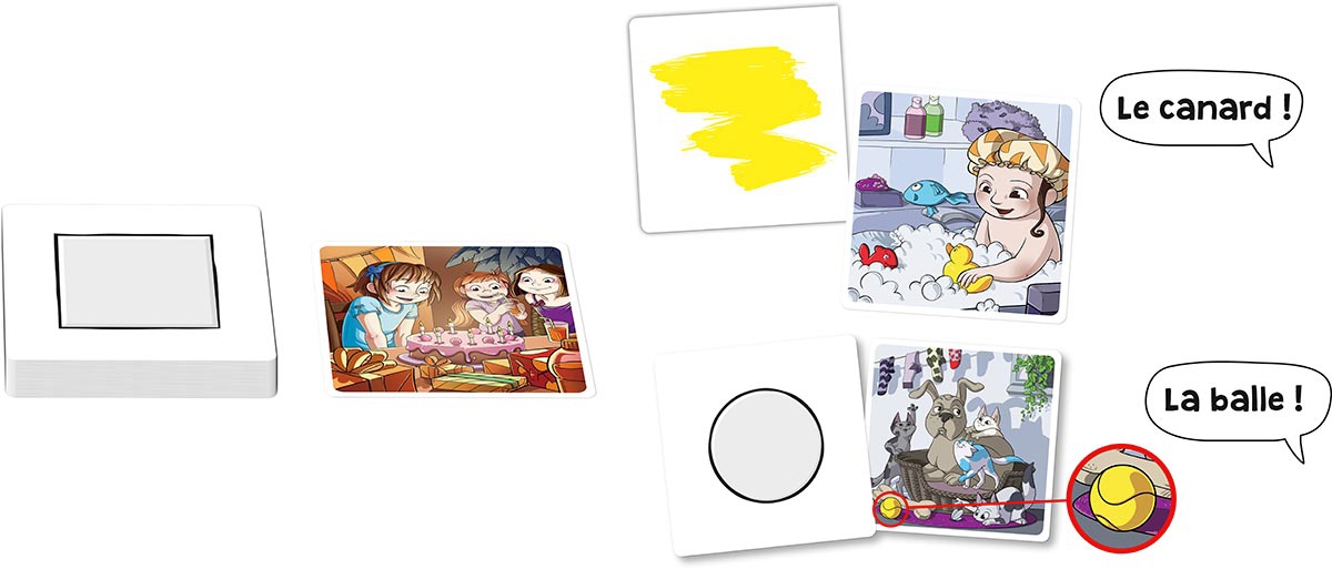 Chacun leur tour, les joueurs retournent une carte et révèlent ainsi une illustration et un élément à trouver (forme ou couleur). Il s‘agit d‘être le plus rapide à trouver l’élément correspondant sur l’illustration : le premier qui y parvient gagne la carte. Puis on recommence un nouveau tour. Le premier qui cumule 5 cartes gagne !