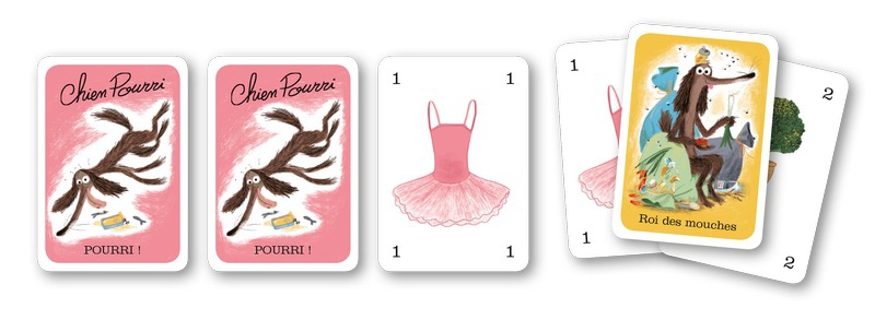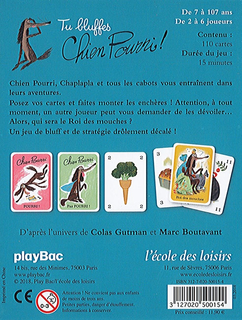 Choisissez vos personnages, posez vos cartes et… faites monter les enchères ! Alors qui sera le prochain roi des mouches ? Le premier joueur annonce une valeur comprise entre 1 et 11. Le suivant pose une carte et doit annoncer une valeur supérieure ou égale. Saura-t-il bluffer sans se faire prendre ? Le premier joueur à avoir retourné ses 5 cartes « Personnage » côté « Pas Pourri » gagne la partie. Distribuez à chaque joueur les 5 cartes de son personnage. Il les place devant lui, face « POURRI » (fond rouge). Distribuez à chaque joueur 5 cartes « Bluff ». Le joueur qui a retourné ses 5 cartes « Personnage » face « Pas POURRI » en premier a gagné !