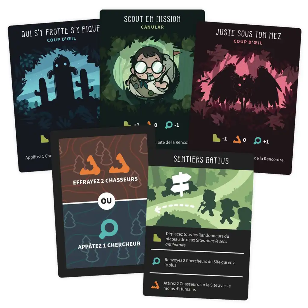 Choisissez votre Cryptide préféré et préparez-vous à jouer ! Chaque carte Cryptide comporte un Pouvoir unique que vous pourrez utiliser à votre avantage pendant la Phase de Jour.