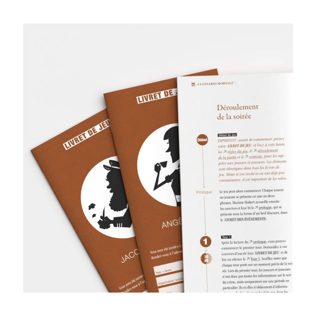 Culinario Mortale est une gamme de dîner enquête. Le temps d’un repas, les joueurs incarneront chacun un personnage. Un drame vient d’avoir lieu, les joueurs devront mener l’enquête pour trouver le coupable qui se trouve parmi eux. Le rythme est soutenue et l’intrigue est palpitante, pour une soirée pleine de rebondissements !