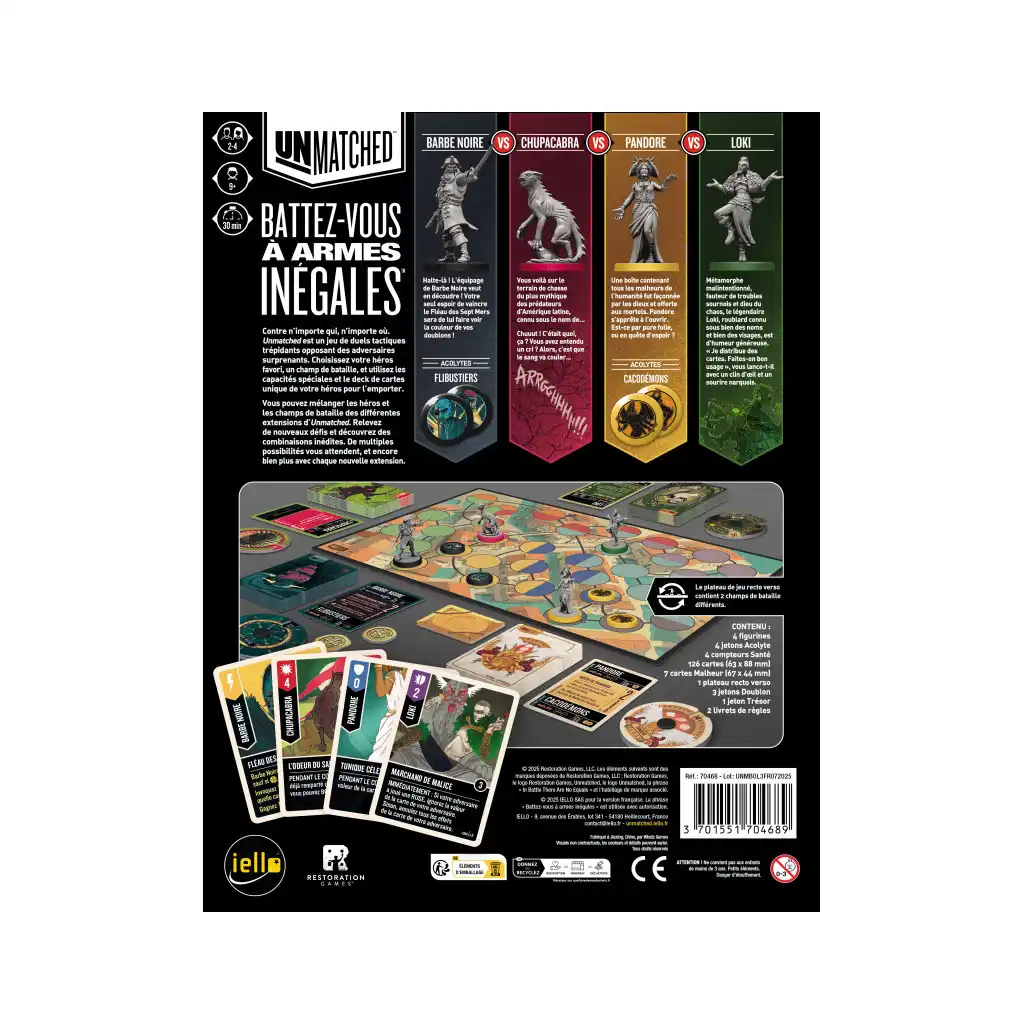 Avec ses quatre personnages emblématiques et son plateau de jeu recto verso, Unmatched propose des sensations de jeu uniques permettant de vivre l’intensité du jeu d’escarmouche sur un format bien plus compact et accessible. Proposant un fun immédiat et permettant de découvrir les capacités des héros au fil des batailles, Unmatched génère des parties ultra intenses et toujours variées.