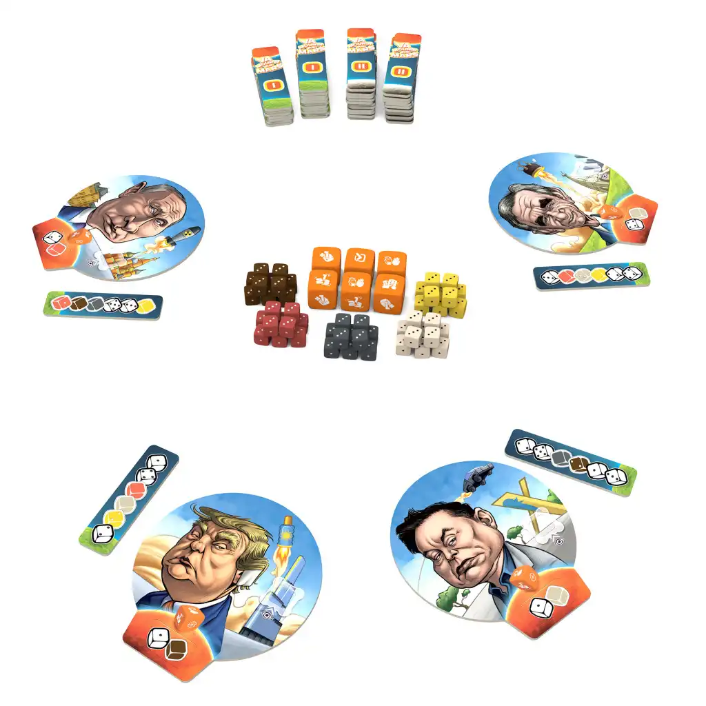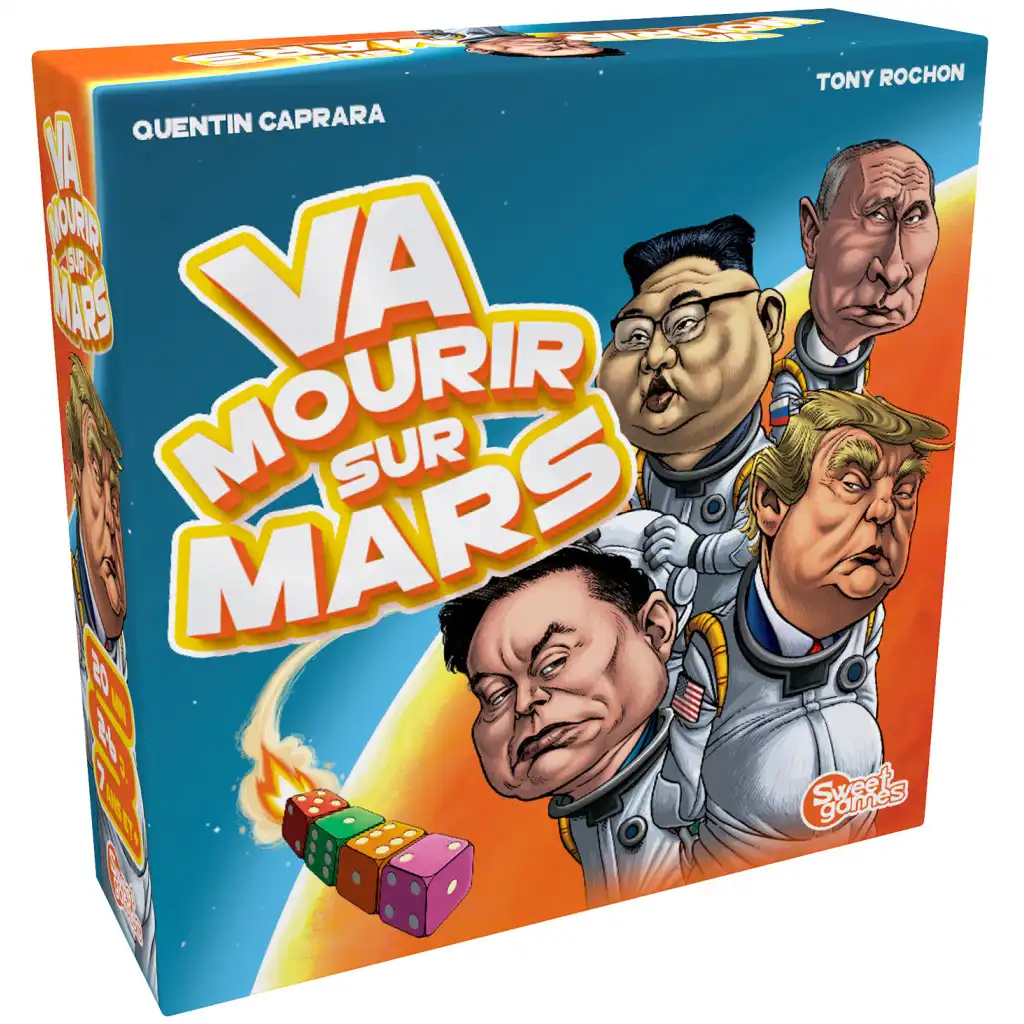 Dans Va Mourir sur Mars, vous incarnez un milliardaire ou une puissance spatiale qui se lance dans la course à la conquête de l’espace. Construisez votre fusée à base de mini-dés empilés selon des codes de lancement et, après avoir atteint la Lune, partez à la conquête de Mars. Jouez avec Elon Musk, Jeff Bezos, Poutine, Trump… et réussissez deux lancements de votre fusée : un depuis la Terre vers la Lune et l’autre depuis la Lune vers Mars pour gagner !