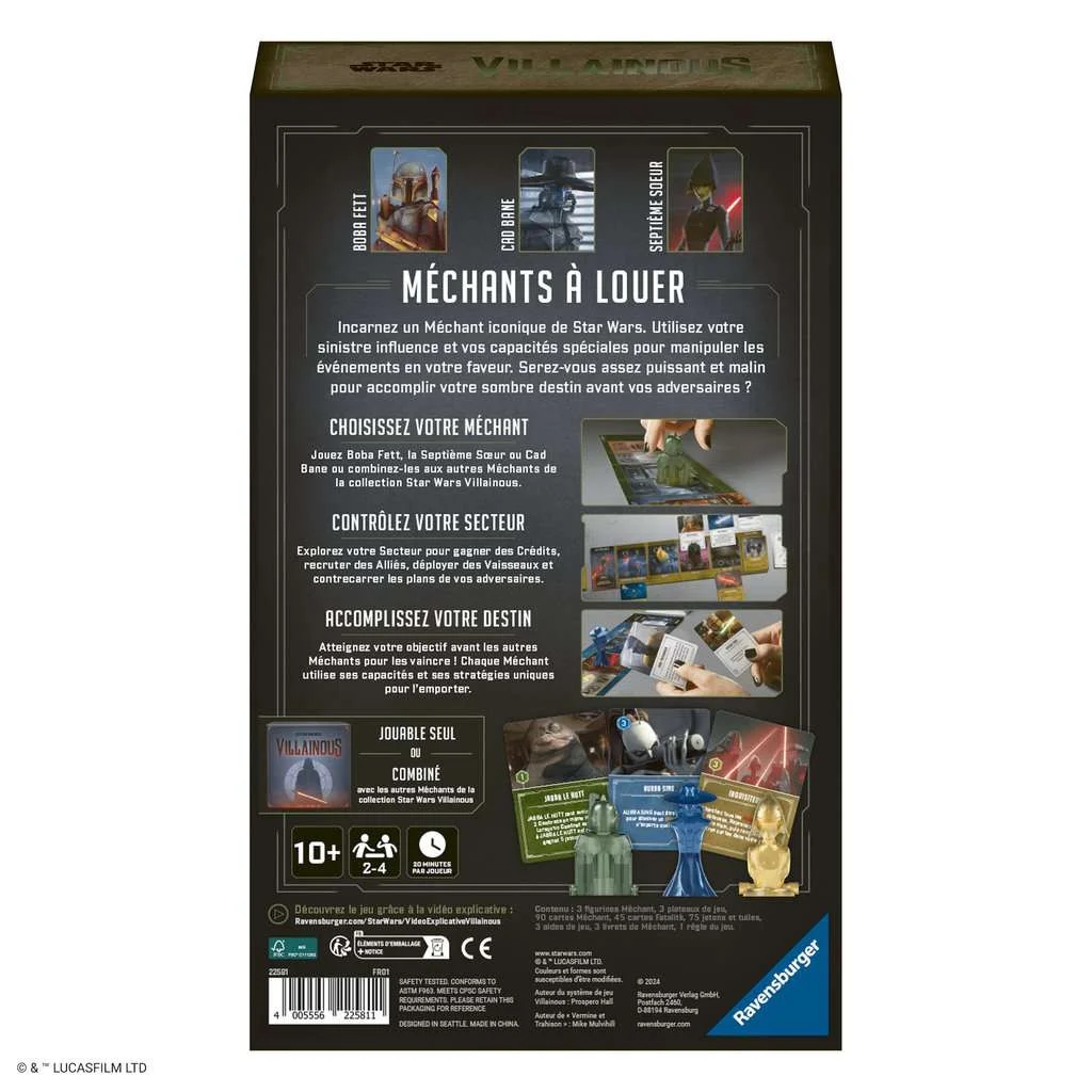 Réveillez le Mal qui est en vous… Suivez vos propres plans machiavéliques, soyez opportunistes et stratège pour devenir le plus grand méchant de Star Wars ! Avec ces 3 nouveaux méchants vous aurez encore plus de possibilités de faire le mal !Jouable seul ou combinable avec n’importe quel autre jeu de la collection Star Wars Villainous.