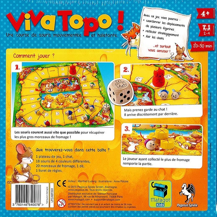 Viva Topo ! est un jeu de société accessible dès 4 ans. Il permet de développer d’initier les plus jeunes à la notion de stratégie : il faut coordonner les déplacements de plusieurs figurines, réfléchir stratégiquement et fuir les chats.