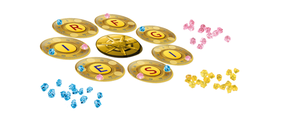 Vos pierres précieuses ne sont pas à l’abri chez vous, vous feriez mieux de les mettre dans des coffres forts ! Chaque coffre demande un mot de passe pour pouvoir placer une ou plusieurs de vos pierres. Plus vous mettez vos pierres précieuses en sécurité, plus vous vous approchez de la victoire. Mais attention, les coffres ne se ferment définitivement que lorsqu’ils sont pleins !